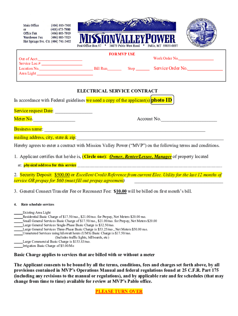 FOR MVP USEOut of Acct. Service Loc.# Location No. Area LightBill RunWork Order No.Service Order No.StopELECTRICAL SERVICE CONTRACT In accordance with Federal guidelines we need a copy of the applicant(s)