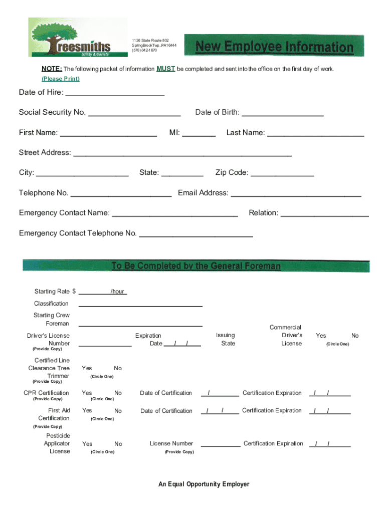1136 State Route 502 SprlngBrookTwp.,PA16444 (570) 8421670NOTE: The following packet of information MUST be completed and sent into the office on the first day of work. (Please Print)Date of Hire: Social Security No.Date of Birth:First Name: ___MI: ___Last Name: ___Street Address: ___ City: ___State: ___Zip Code: ___Telephone No. ___ Email Address: ___ Emergency Contact Name: ___Relation: ___Emergency Contact Telephone No. ___Starting Rate $/hourClassification Starting