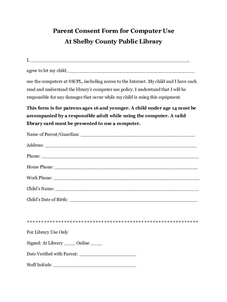 This form is required for parents or guardians to authorize children aged 16 and younger to use computers at Shelby County Public Library, including Internet access. It outlines responsibilities for