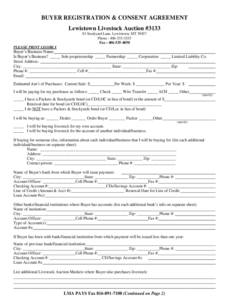 Este documento registra la información del comprador y su consentimiento para revelar información financiera a la subasta de ganado Lewistown. Incluye detalles sobre el tipo de negocio, método de pago y términos y condiciones relacionados con la compra de ganado.