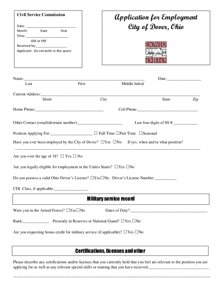This document serves as an application for employment with the City of Dover, Ohio, requiring personal information, work experience, education background, and references from the applicant.