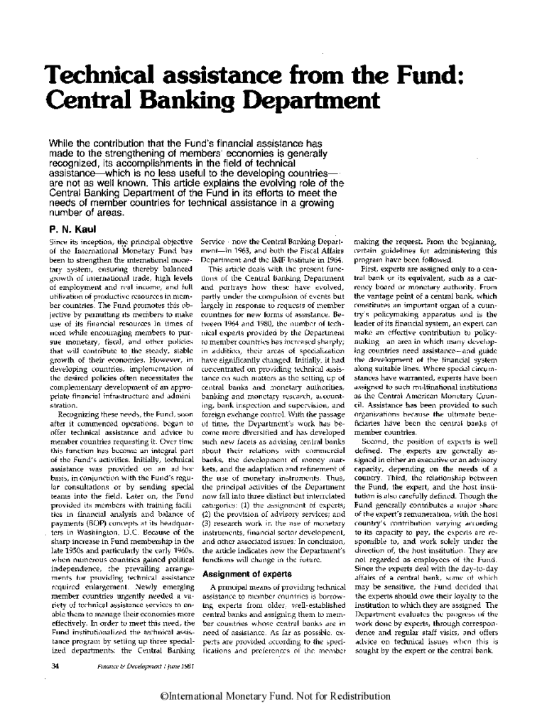 Technical assistance from the Fund: Central Banking Department While the contribution that the Fund\'s financial assistance has made to the strengthening of members\' economies is generally recognized, its accomplishments in the field of technical assistancewhich is no less useful to the developing countries are not as well known. This article explains the evolving role of the Central Banking Department of the Fund in its efforts to meet the needs of member countries for technical assistance...