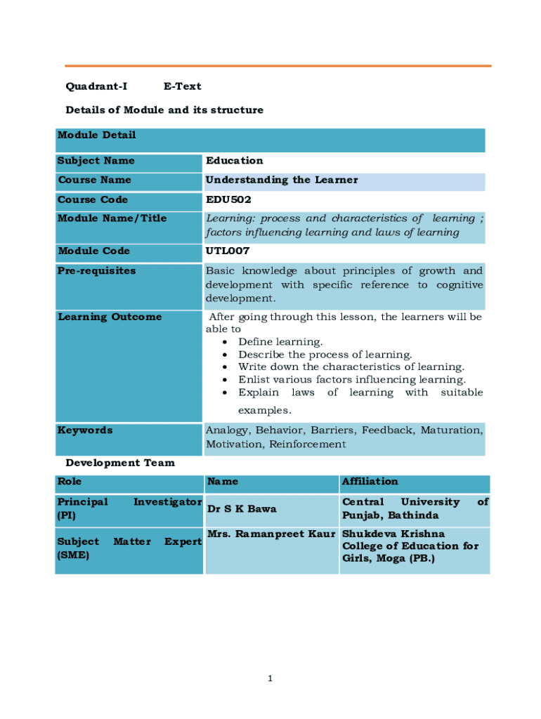QuadrantIETextDetails of Module and its structure Module Detail Subject NameEducationCourse NameUnderstanding the LearnerCourse CodeEDU502Module Name/TitleLearning: process and characteristics of learning ; factors influencing learning and laws of learningModule CodeUTL007PrerequisitesBasic knowledge about principles of growth and development with specific reference to cognitive development.Learning OutcomeAfter going through this lesson, the learners will be able to Define learning