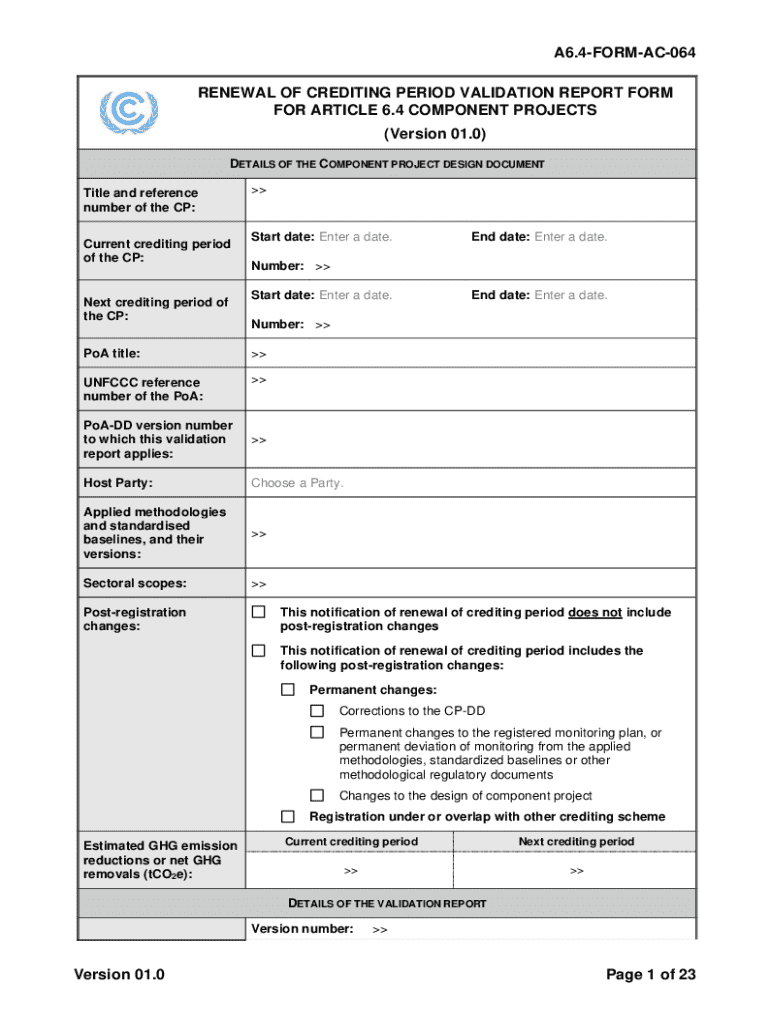 This form is used to validate the renewal of the crediting period for component projects under Article 6.4. It includes details of the project design document, validation findings, and compliance with applicable requirements. This documentation is essential for ensuring adherence to UNFCCC standards.