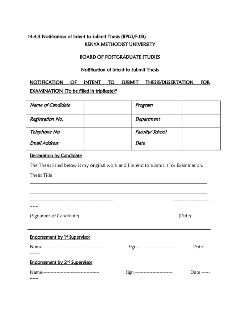 This document serves as a formal notification for candidates intending to submit their thesis or dissertation for examination. It includes sections for candidate details, thesis title, and endorsements