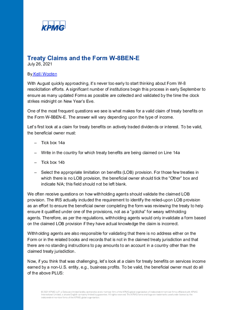 This document discusses the procedures and requirements for claiming treaty benefits on Form W-8BEN-E, detailing the necessary steps for both income types: actively traded dividends or interest and