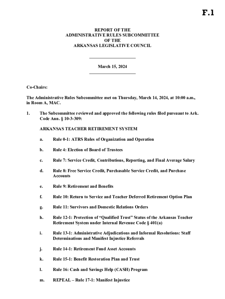 F.1 REPORT OF THE ADMINISTRATIVE RULES SUBCOMMITTEE OF THE ARKANSAS LEGISLATIVE COUNCIL ___ March 15, 2024 ___ CoChairs: The Administrative Rules Subcommittee met on Thursday, March 14, 2024, at 10:00 a.m., in Room A, MAC. 1.The Subcommittee reviewed and approved the following rules filed pursuant to Ark. Code Ann. 103309: ARKANSAS TEACHER RETIREMENT SYSTEM a.Rule 01: ATRS Rules of Organization and Operationb.Rule 4: Election of Board of Trusteesc.Rule 7: Service Credit, Contributions,...