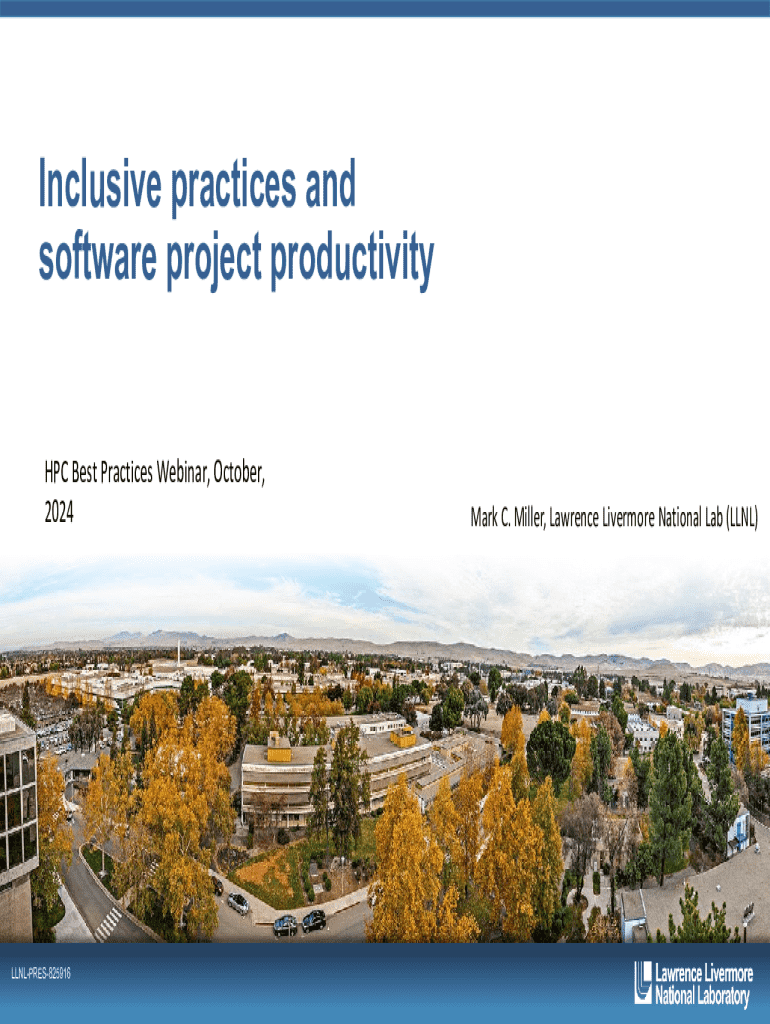Inclusive practices and software project productivity HPC Best Practices Webinar, October, 2024LLNLPRES825916Mark C. Miller, Lawrence Livermore National Lab (LLNL)Outline Inclusion and bias Inclusion and productivity Practices for cultivating inclusion Some resources2 LLNLPRES825916Why inclusion?Talent is equally distributed across all sociocultural groups access and opportunity are not.3 LLNLPRES825916What is inclusion?In the context of open source