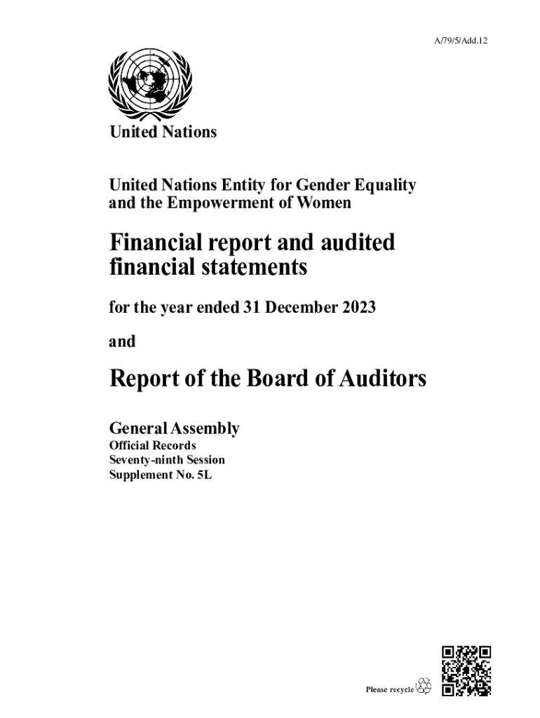 Этот документ представляет собой финансовый отчет и аудированные финансовые заявления Организации Объединенных Наций о Гендерном равенстве и расширении прав и возможностей женщин (UN-Women) за год, закончившийся 31 декабря 2023 года. В нем содержится информация о финансовом положении UN-Women, результаты аудита и рекомендации Совета аудиторов.