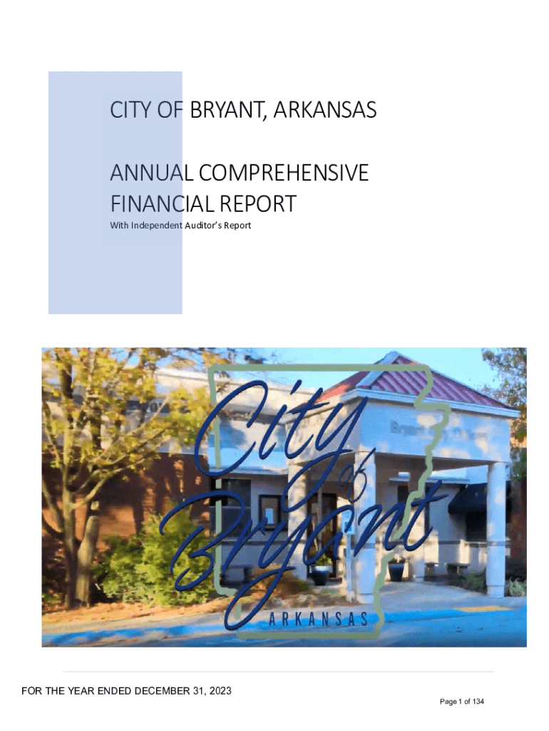 This document presents the financial statements for the City of Bryant, Arkansas, for the year ended December 31, 2023. It includes independent auditor\'s reports, management\'s discussion and analysis,