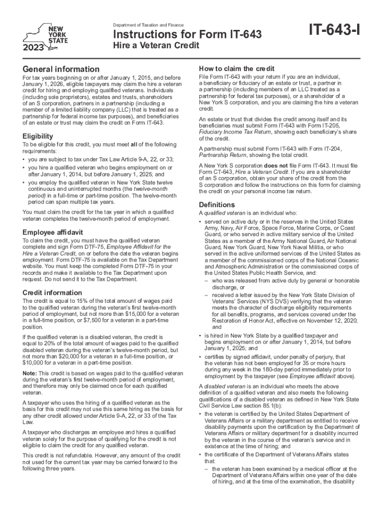 Instructions for claiming the Hire a Veteran Credit for hiring qualified veterans in New York State, including eligibility requirements, credit computation, and necessary forms for various types of