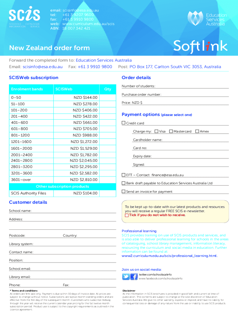 This document is used for placing orders for SCISWeb subscriptions and other SCIS related products. It includes details such as pricing based on the number of students, payment options, customer details,