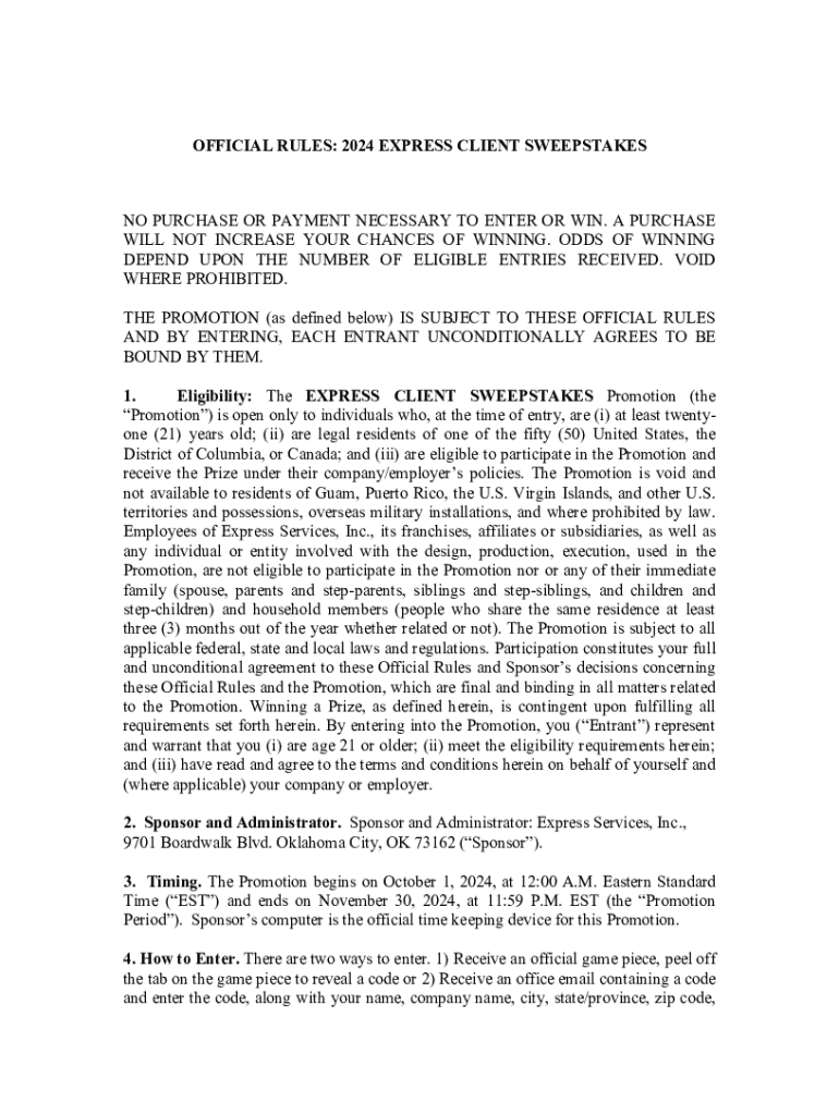 These are the official rules for the 2024 Express Client Sweepstakes, detailing eligibility, entry methods, prize selection, and legal conditions for participants.