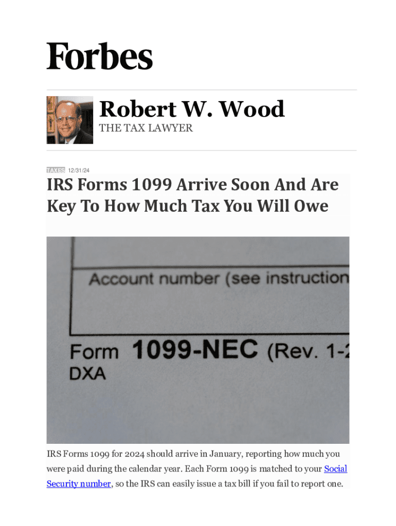 Robert W. Wood THE TAX LAWYERTAXES 12/31/24IRS Forms 1099 Arrive Soon And Are Key To How Much Tax You Will OweIRS Forms 1099 for 2024 should arrive in January, reporting how much you were paid during