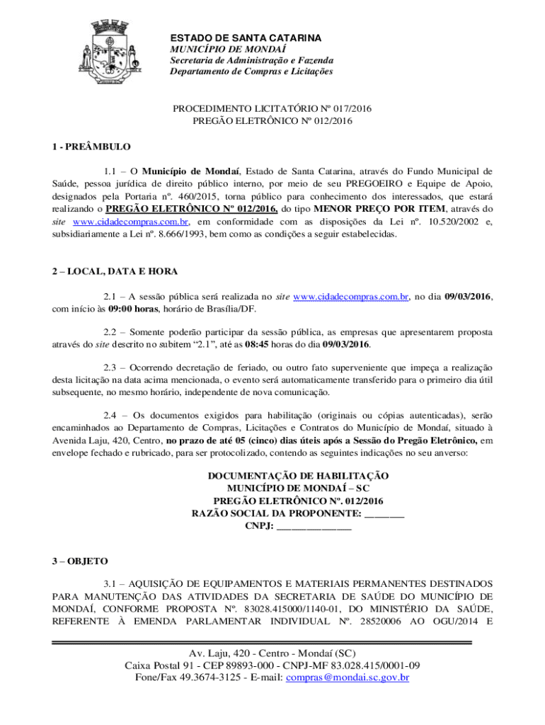 Este documento trata do Pregão Eletrônico nº 012/2016 referente à aquisição de equipamentos e materiais permanentes para a manutenção das atividades da Secretaria de Saúde do Município de