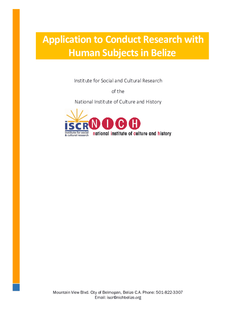 This document serves as an application for researchers intending to conduct studies involving human subjects in Belize. It outlines requirements, objectives, methods, and ethical considerations related to the research project. It also provides instructions for completing the application, including sections on research protocols, funding, and confidentiality measures.