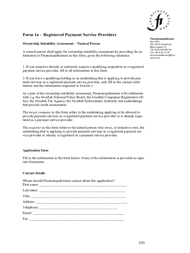 Este formulario debe ser completado por las personas naturales que solicitan una evaluación de idoneidad de propiedad a Finansinspektionen en relación con la adquisición de proveedores de servicios de pago registrados. Proporciona información sobre el adquirente, detalles de contacto y antecedentes relevantes para la evaluación.