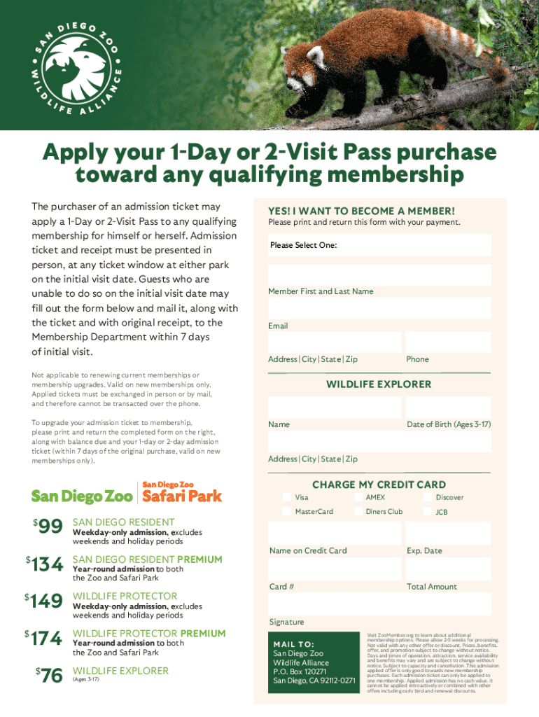 Apply your 1Day or 2Visit Pass purchase toward any qualifying membership The purchaser of an admission ticket may apply a 1Day or 2Visit Pass to any qualifying membership for himself or herself. Admission ticket and receipt must be presented in person, at any ticket window at either park on the initial visit date. Guests who are unable to do so on the initial visit date may fill out the form below and mail it, along with the ticket and with original receipt, to the Membership Department...