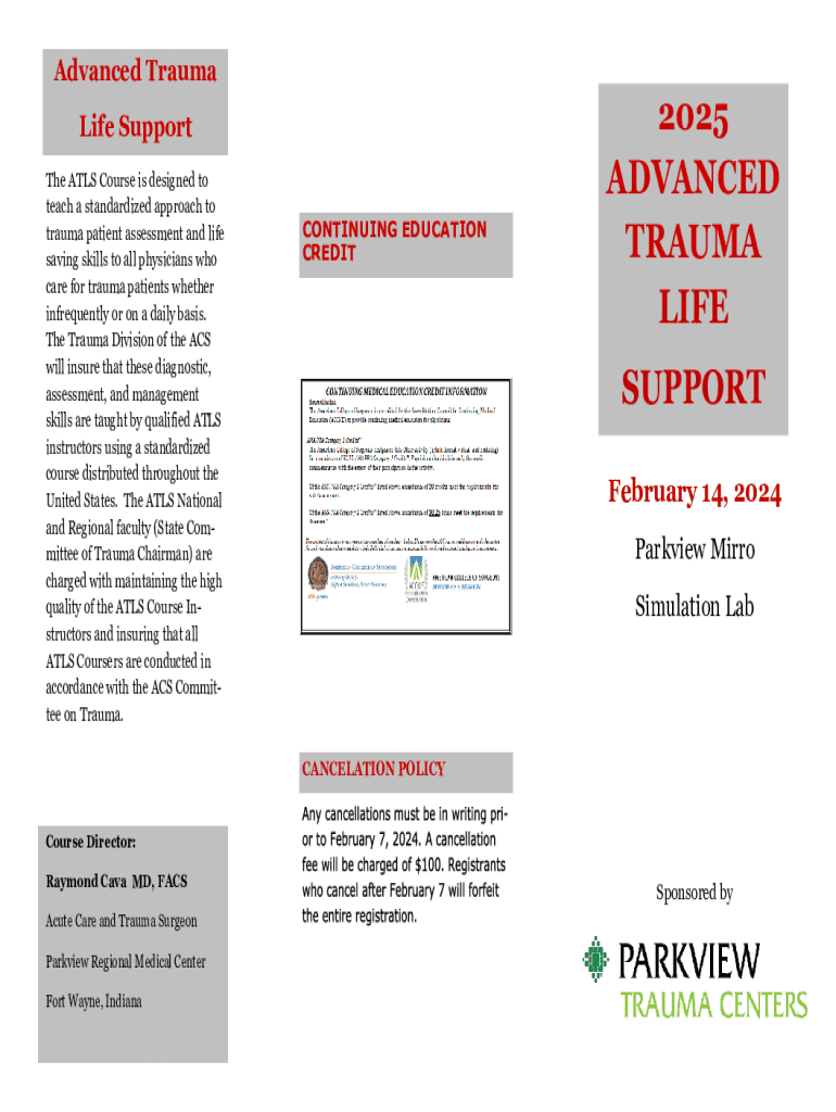 This registration form is for the Advanced Trauma Life Support (ATLS) Course designed for physicians who care for trauma patients. The course aims to teach standardized trauma assessment and life-saving skills, featuring a comprehensive program schedule and important details regarding fees and cancellation policy.
