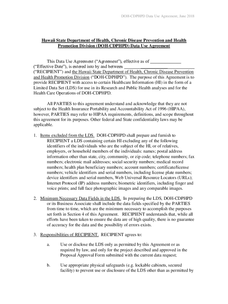 The doh-cdphpd data use agreement is a legally binding document that outlines the terms and conditions under which data provided by the Department of Health (DOH) and the Center for Disease and Prevention (CDPHPD) can be accessed, used, and shared by the recipient.