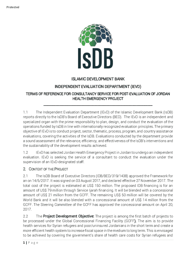 ProtectedISLAMIC DEVELOPMENT BANK INDEPENDENT EVALUATION DEPARTMENT (IEVD) TERMS OF REFERENCE FOR CONSULTANCY SERVICE FOR POSTEVALUATION OF JORDAN HEALTH EMERGENCY PROJECT 1.1 The Independent Evaluation Department (IEvD) of the Islamic Development Bank (IsDB) reports directly to the IsDBs Board of Executive Directors (BED). The IEvD is an independent and specialized organ with the prime