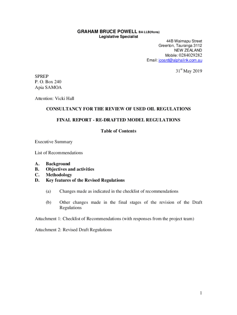 Report outlining the review and revision of the Draft Model Used Oil Regulations for Pacific Island countries to facilitate effective regulatory framework governing the management, storage, and recycling of used oil.