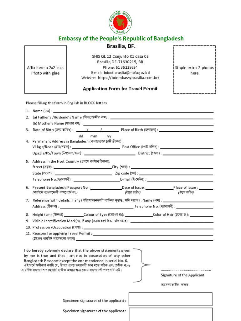 This form is used to apply for a travel permit from the Embassy of the People\'s Republic of Bangladesh in Brazil. Applicants are required to fill out personal information including name, father\'s