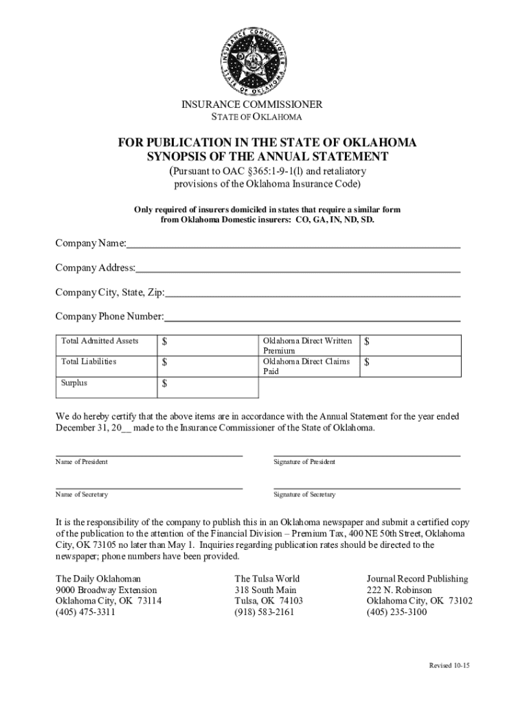 INSURANCE COMMISSIONER STATE OF OKLAHOMAFOR PUBLICATION IN THE STATE OF OKLAHOMA SYNOPSIS OF THE ANNUAL STATEMENT (Pursuant to OAC 365:191(l) and retaliatory provisions of the Oklahoma Insurance Code)Only required of insurers domiciled in states that require a similar form from Oklahoma Domestic insurers: CO, GA, IN, ND, SD.Company Name: Company Address: Company City, State, Zip: Company Phone Number: Total Admitted Assets$Total Liabilities$Surplus$Oklahoma Direct Written Premium Oklahoma