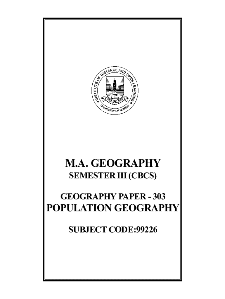 31M.A. GEOGRAPHY SEMESTER III (CBCS) GEOGRAPHY PAPER 303POPULATION GEOGRAPHY SUBJECT CODE:99226 UNIVERSITY OF MUMBAI Prof. Suhas Pednekar ViceChancellor, University of Mumbai, Prof. Ravindra D. Kulkarni
