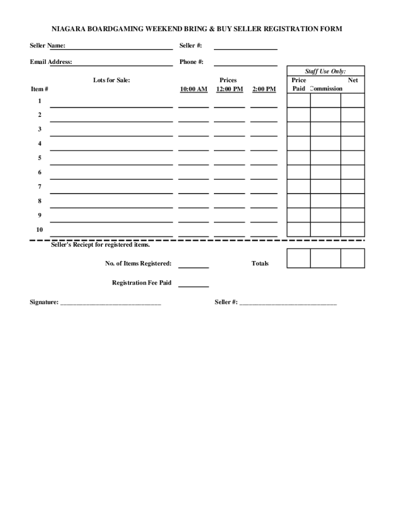 This form is used for sellers to register items for sale at the Niagara Boardgaming Weekend. Sellers must provide their name, contact information, and details about the items they wish to sell.