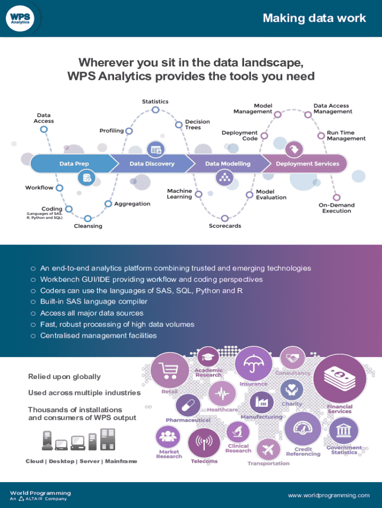 Making data workWherever you sit in the data landscape, WPS Analytics provides the tools you needo o o o o o oAn endtoend analytics platform combining trusted and emerging technologies Workbench GUI/IDE providing workflow and coding perspectives Coders can use the languages of SAS, SQL, Python and R Builtin SAS language compiler Access all major data sources Fast, robust processing of high data volumes Centralised management facilitiesRelied upon globally Used across multiple industries...