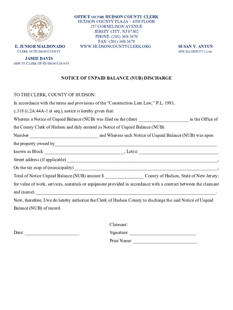 Este formulario se utiliza para autorizar al secretario del condado de Hudson a descargar un Aviso de Saldo Pendiente (NUB) relacionado con un trabajo, servicios, materiales o equipos proporcionados