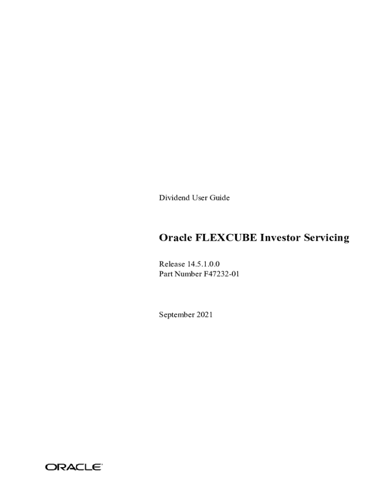 This user guide provides comprehensive instructions on the maintenance, processing, and automation of dividends in the Oracle FLEXCUBE Investor Servicing system. It covers functionalities related
