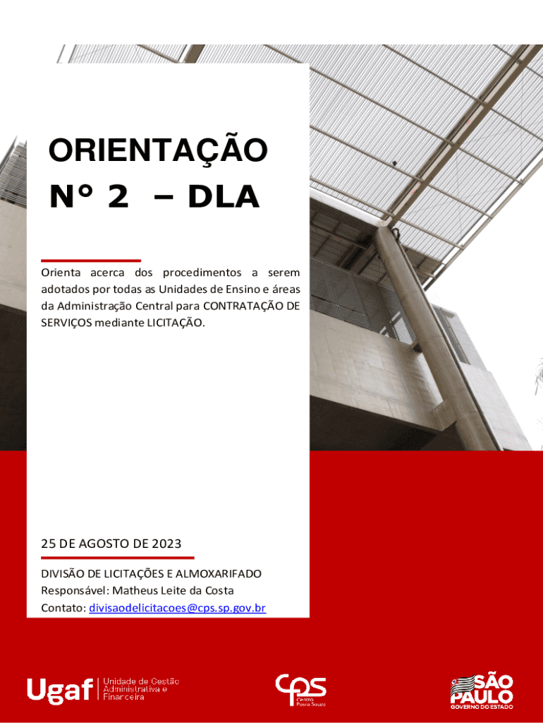 ORIENTAO N 2 DLA Verso 1/2022 Orienta acerca dos procedimentos a serem adotados por todas as Unidades de Ensino e reas da Administrao Central para CONTRATAO DE SERVIOS mediante LICITAO.25 DE AGOSTO DE 2023 DIVISO DE LICITAES E ALMOXARIFADO Responsvel: Matheus Leite da Costa Contato: divisaodelicitacoes@cps.sp.gov.br1SUMRIO I PROCEDIMENTO PARA MONTAGEM DO PEDIDO ...............................3 1 DA NECESSIDADE .....................................