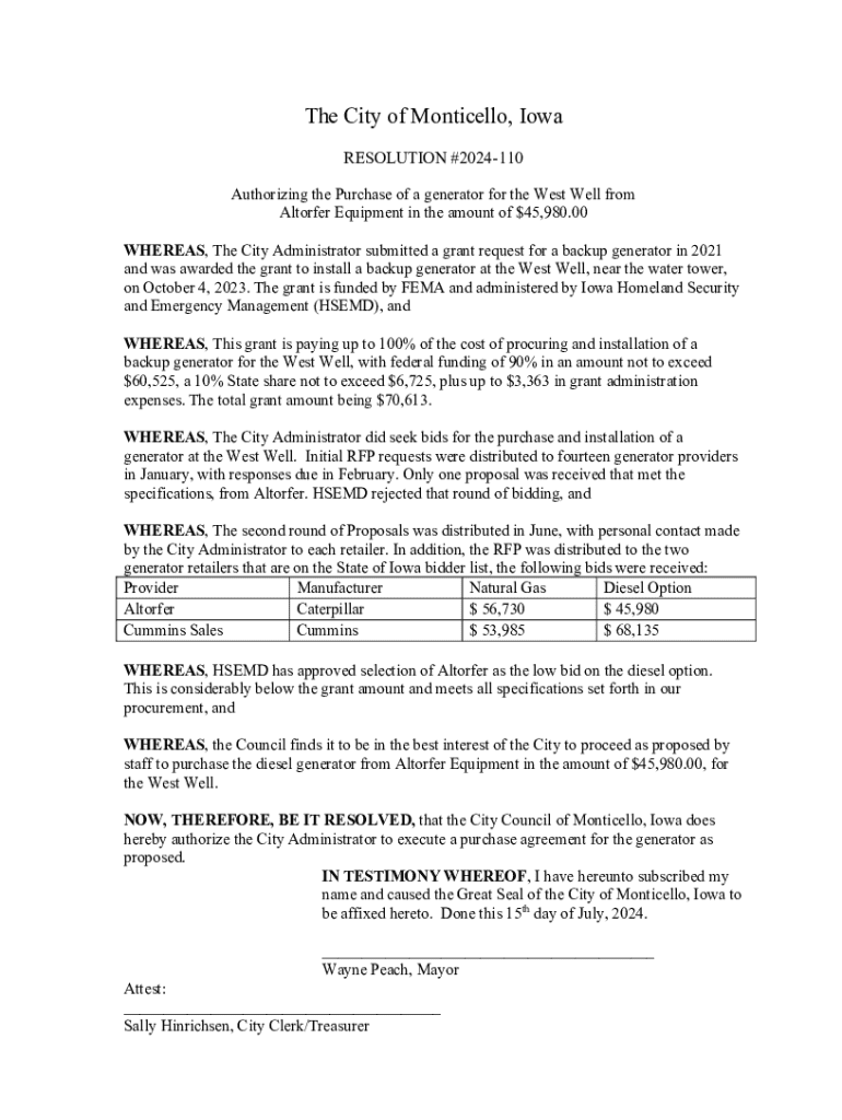 This resolution authorizes the purchase of a diesel generator from Altorfer Equipment for the West Well in Monticello, Iowa, funded by a FEMA grant. The resolution includes details on the procurement process, grant funding, and the selected vendor.
