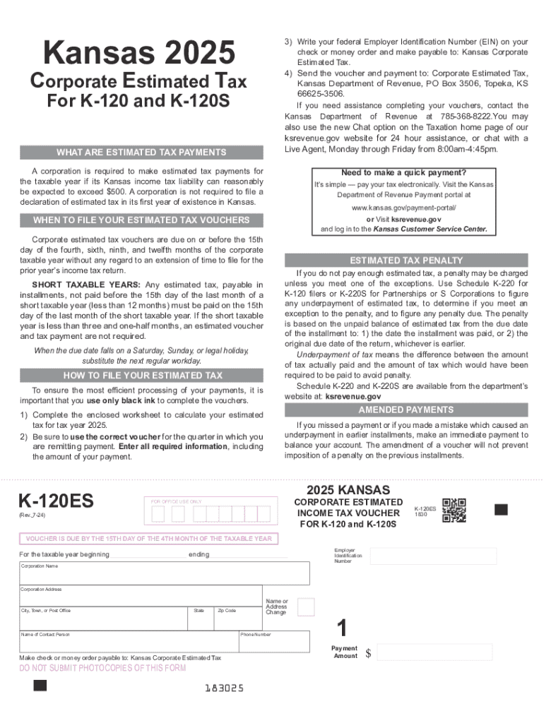 This document provides vouchers for corporations to make estimated tax payments in Kansas for the year 2025. Corporations are required to make estimated tax payments if their Kansas income tax liability is expected to exceed $500. The document includes guidelines on how to file, payment due dates, and instructions for calculating the estimated tax. It also contains worksheets for documenting payments and information for contacting the Kansas Department of Revenue for assistance.