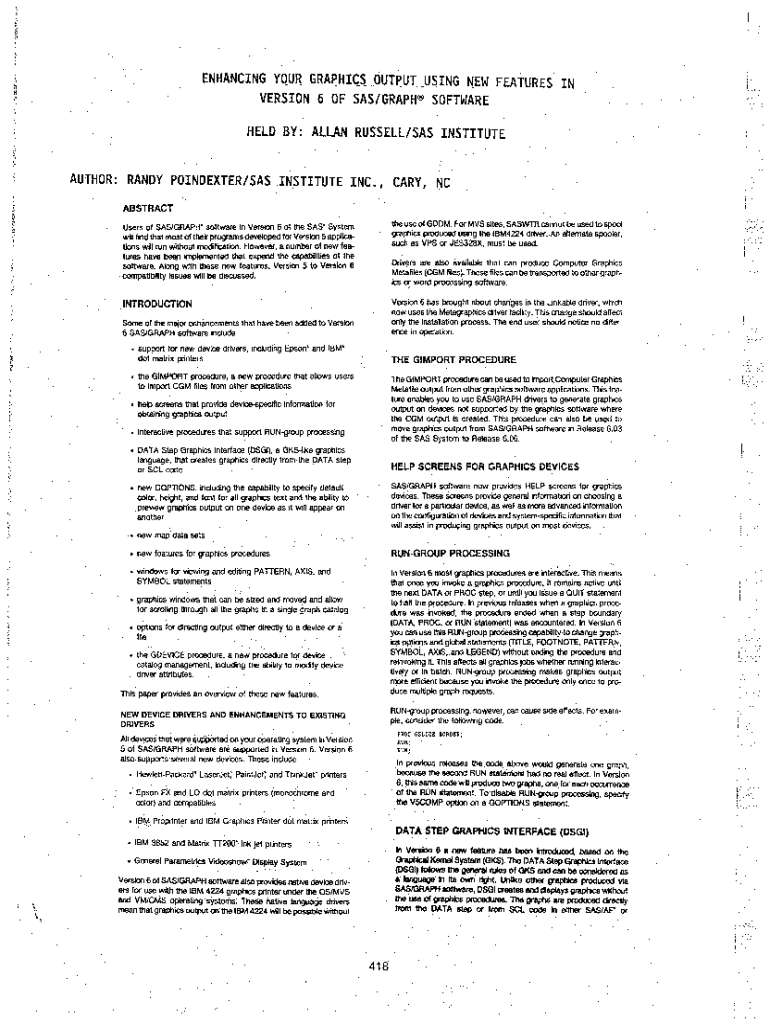 ENHANCING YQUR GR.AH!( _Ol.ITUT _UING EW FEATURES IN VERSION 6 OF SAS/GRAPH SOFTWARE HELD BY: ALLAN RUSSELL/SAS INSTITUTE AUTHOR: RANDY POINDEXTERISAS INSTITUTE INC., CARY, NC ABSTRACT the use of