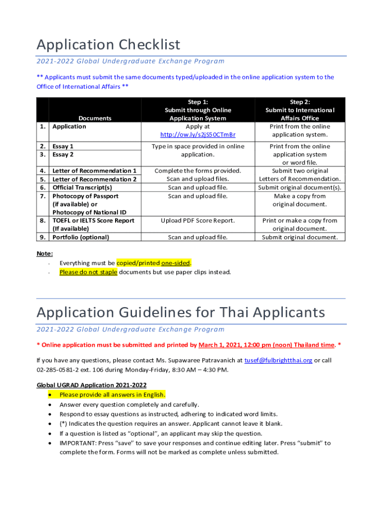 This checklist provides the necessary documents and steps required for applicants to submit their application for the Global Undergraduate Exchange Program. It includes required essays, letters of recommendation, and official transcripts, along with guidelines for submission.