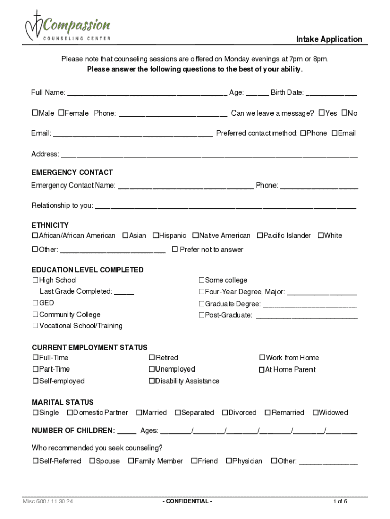 This document is an intake application for counseling services. It collects personal information, reasons for seeking counseling, and details about the individual\'s mental health and history. The applicant is prompted to provide demographic details, emergency contact information, education level, employment status, marital status, and preferences for counseling sessions.