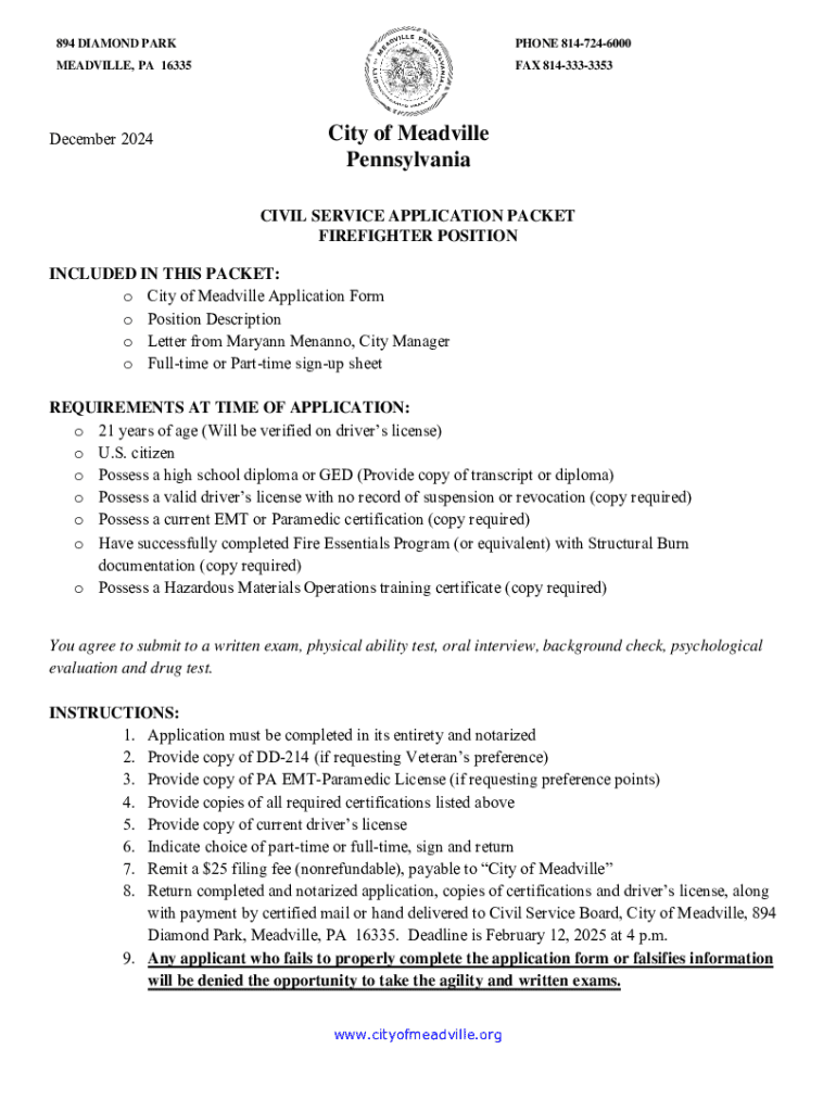 This document is an application packet for the firefighter position with the City of Meadville, Pennsylvania. It includes information on application requirements, important instructions, and details about the role of a firefighter within the department.