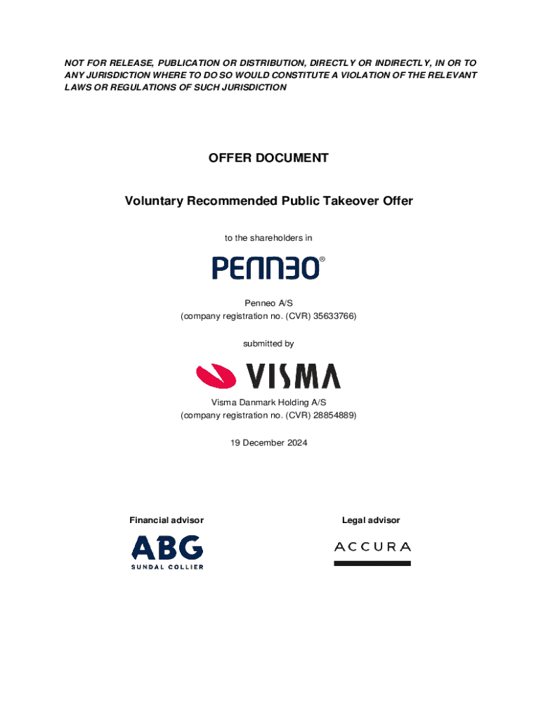This Offer Document outlines the voluntary recommended public takeover offer submitted by Visma Danmark Holding A/S to the shareholders of Penneo A/S. It includes details about the offer price, conditions of the offer, acceptance procedures, and relevant legal considerations under Danish law.