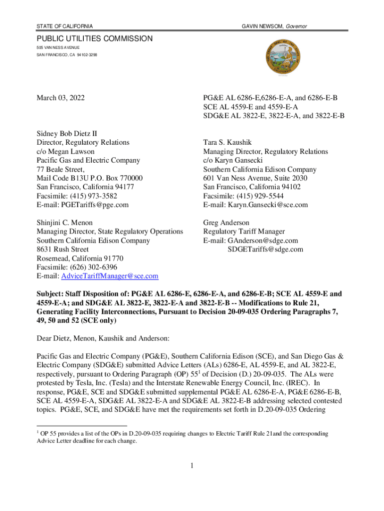 Utility companies that are subject to the regulatory oversight of the Public Utilities Commission are required to file Advice Letter 6286-E-B when changes to their service offerings or rates are proposed.