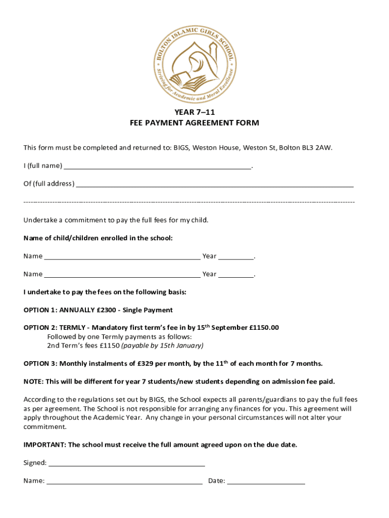 Get the free Fee Payment Agreement Form - boltonislamicgirlsschool org