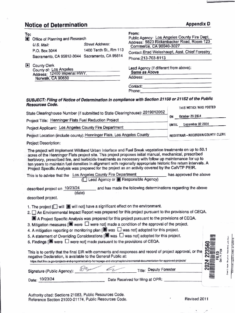Get the free Notice of Determination - bof fire ca