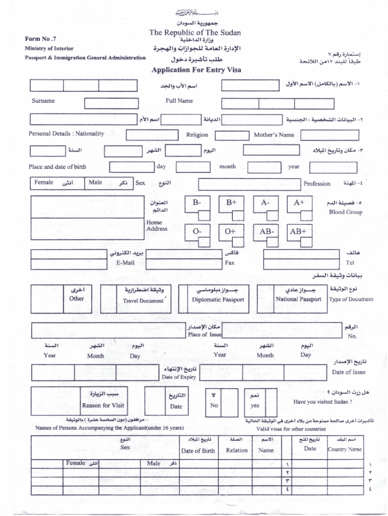 :2Ub,....xlThe Republic of The SudanForm No.71..aJ1Ministry of Interior.!)IJPassport & Immigration General AdministrationOJ!jJ;YWI .)111 VJii.)!JJi,) ;;t:i I.:\"...VApplication For Entry Visa...L.LSurnameI11..1?,I\"!\'.o\';\"\'..:JI,:,ut\"I:11...Mother\'s Name_?,IImonth_IIyeart1Female.IIMaleJISex_111...Iday___Place and date of birthLl:04Jll