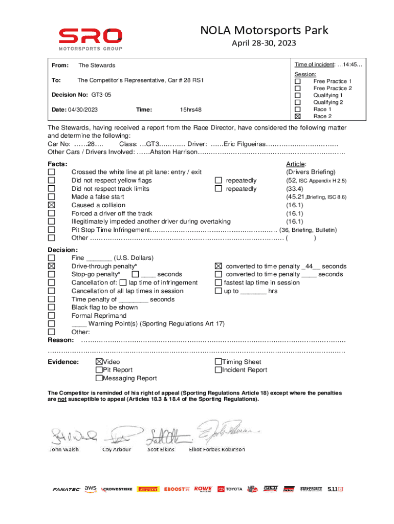 This document outlines the decision made by the Stewards regarding the incident involving Car #28 during the racing sessions at NOLA Motorsports Park from April 28-30, 2023. It details the infractions