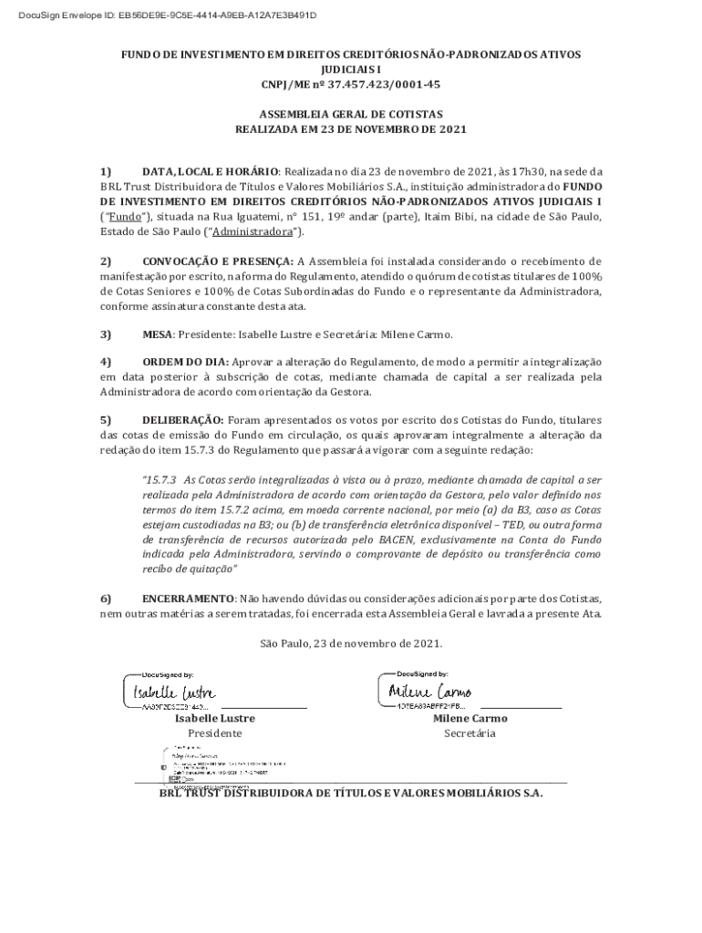 DocuSign Envelope ID: EB56DE9E9C5E4414A9EBA12A7E3B491DFUNDO DE INVESTIMENTO EM DIREITOS CREDITRIOS NOPADRONIZADOS ATIVOS JUDICIAIS I CNPJ/ME n 37.457.423/000145 ASSEMBLEIA GERAL DE COTISTAS REALIZADA