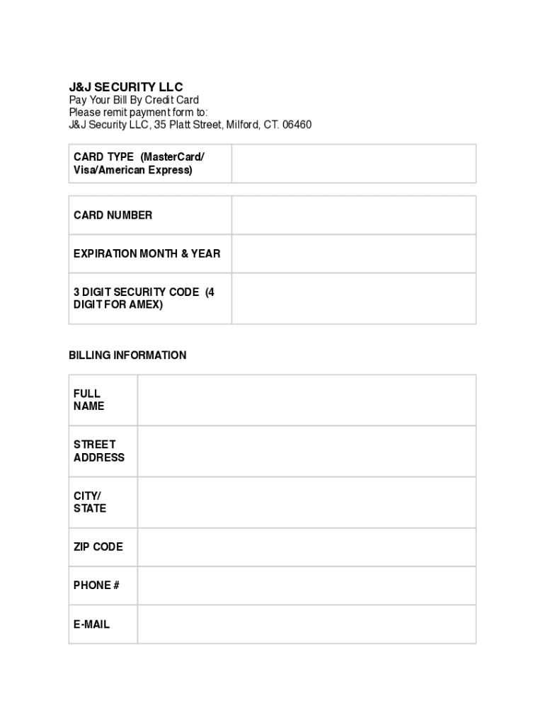 This form is used to remit payment to J&J Security LLC via credit card, providing necessary billing information and card details.