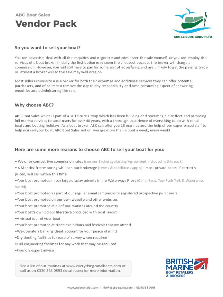 Este paquete proporciona información sobre cómo vender su barco a través de ABC Boat Sales, incluido el proceso de corretaje, los beneficios de utilizar un corredor y los testimonios de la experiencia de ABC en la venta de barcos.