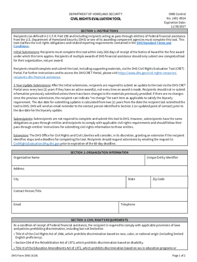 This tool is required for recipients of Federal financial assistance from the U.S. Department of Homeland Security to clarify their civil rights obligations and reporting requirements. Recipients must submit this document upon receiving their Notice of Award and provide updates every two years, as necessary.